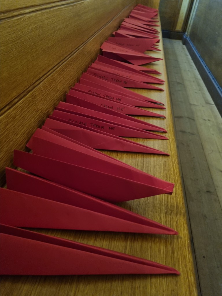 Höstens konsert. Temat för mig blev utmattning – min egen, allas, tidens – i dialog med medeltonsklanger och algoritmer från två orglar. Paperplanes som budbärare, meddelanden, lek.